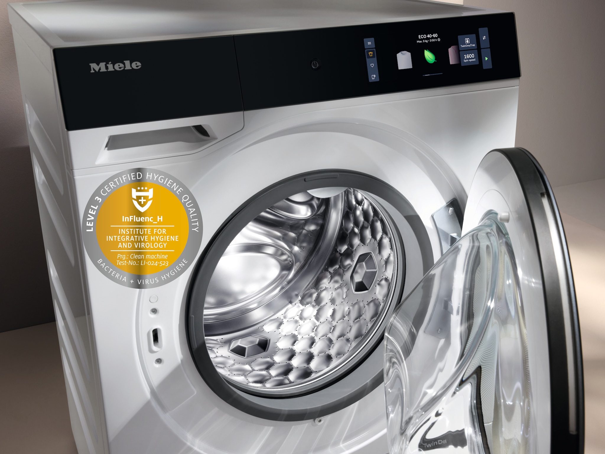 - 10.Wetenschappelijk onderzocht door de hogeschool Albstadt-Sigmaringen en bekroond met het Gold-label van het Instituut voor integratieve hygiëne en virologie – Influenc_H. Geldt voor alle modellen met TwinDos ® en PowerWash bij het programma Machine reinigen in combinatie met de Miele machinereiniger IntenseClean. Geteste bacteriën (bijv. E. coli) en omhulde (bijv. coronavirus) en niet-omhulde virussen (bijv. noro- en adenovirussen).