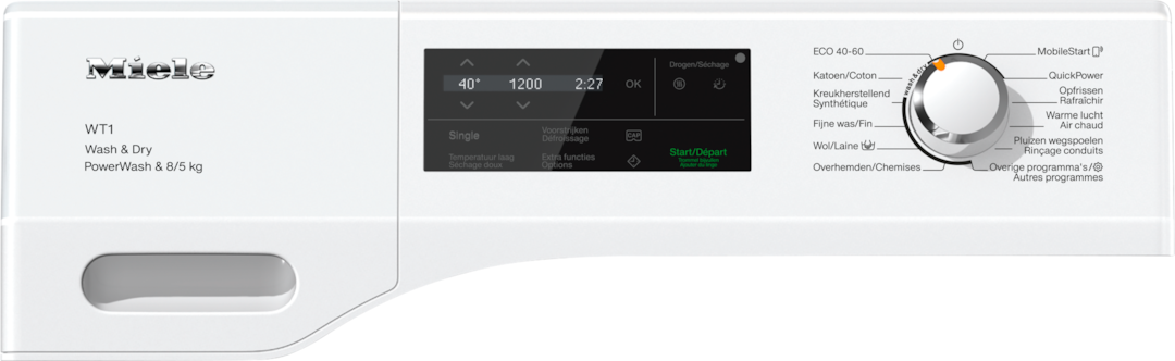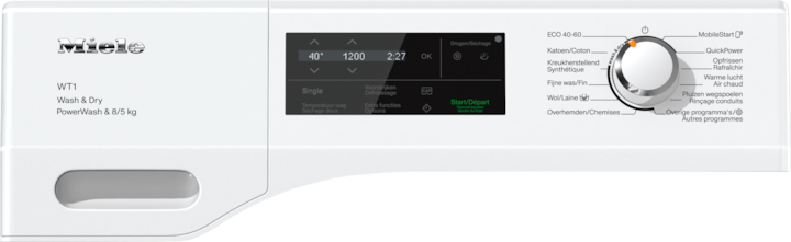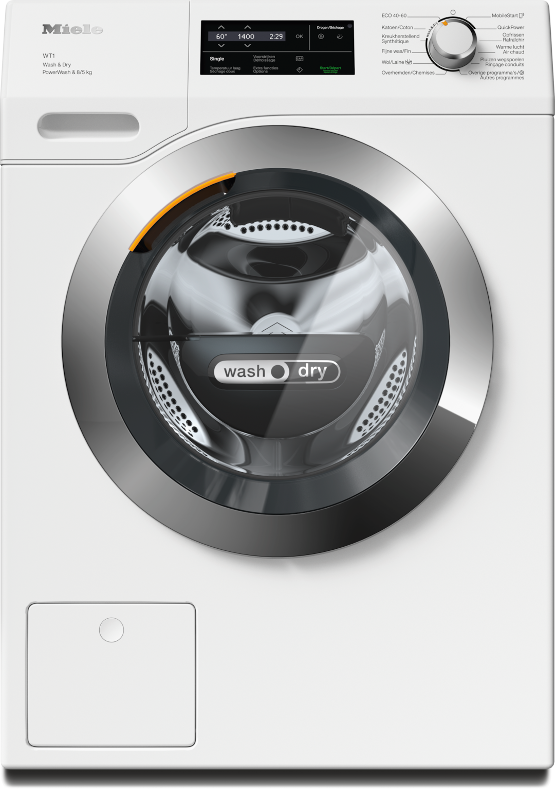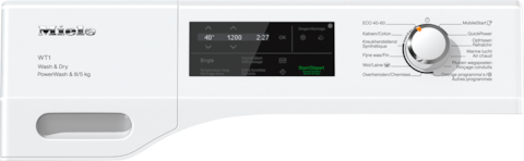 - 4.Pendant la phase de conception de la série de combinés lave-linge/sèche-linge WT1, Miele a testé les modèles et composants principaux avec 5.000 cycles de lavage et 4.000 cycles de séchage (= 5 cycles de lavage et 4 cycles de séchage par semaine, 50 semaines par an) dans divers programmes. En savoir plus : miele.com/20years