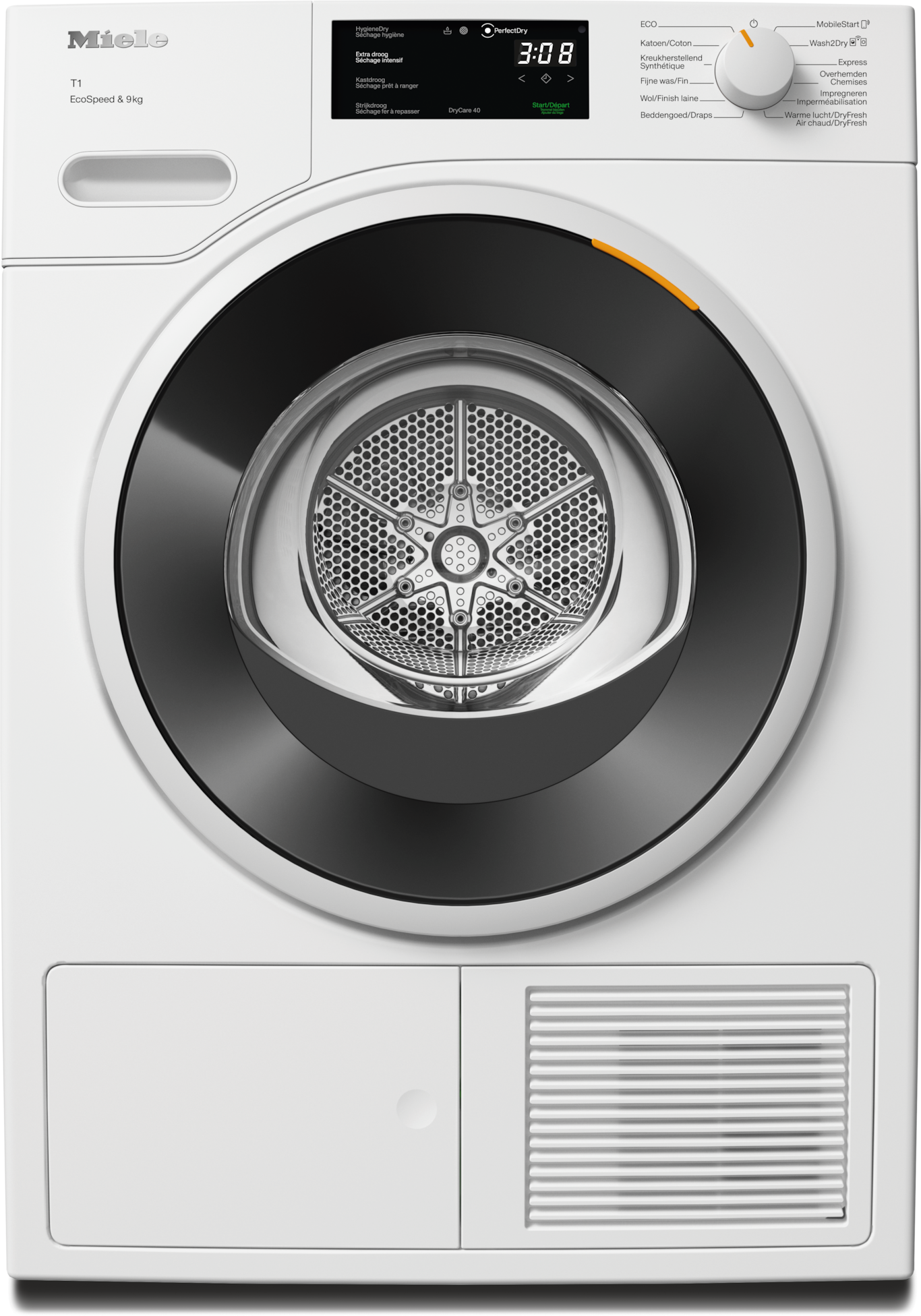 - 8.Gain de temps calculé par rapport aux sèche-linge Miele sans la fonction EcoSpeed avec la même charge et une efficacité énergétique similaire. Résultat testé avec le programme “Coton” à pleine charge.