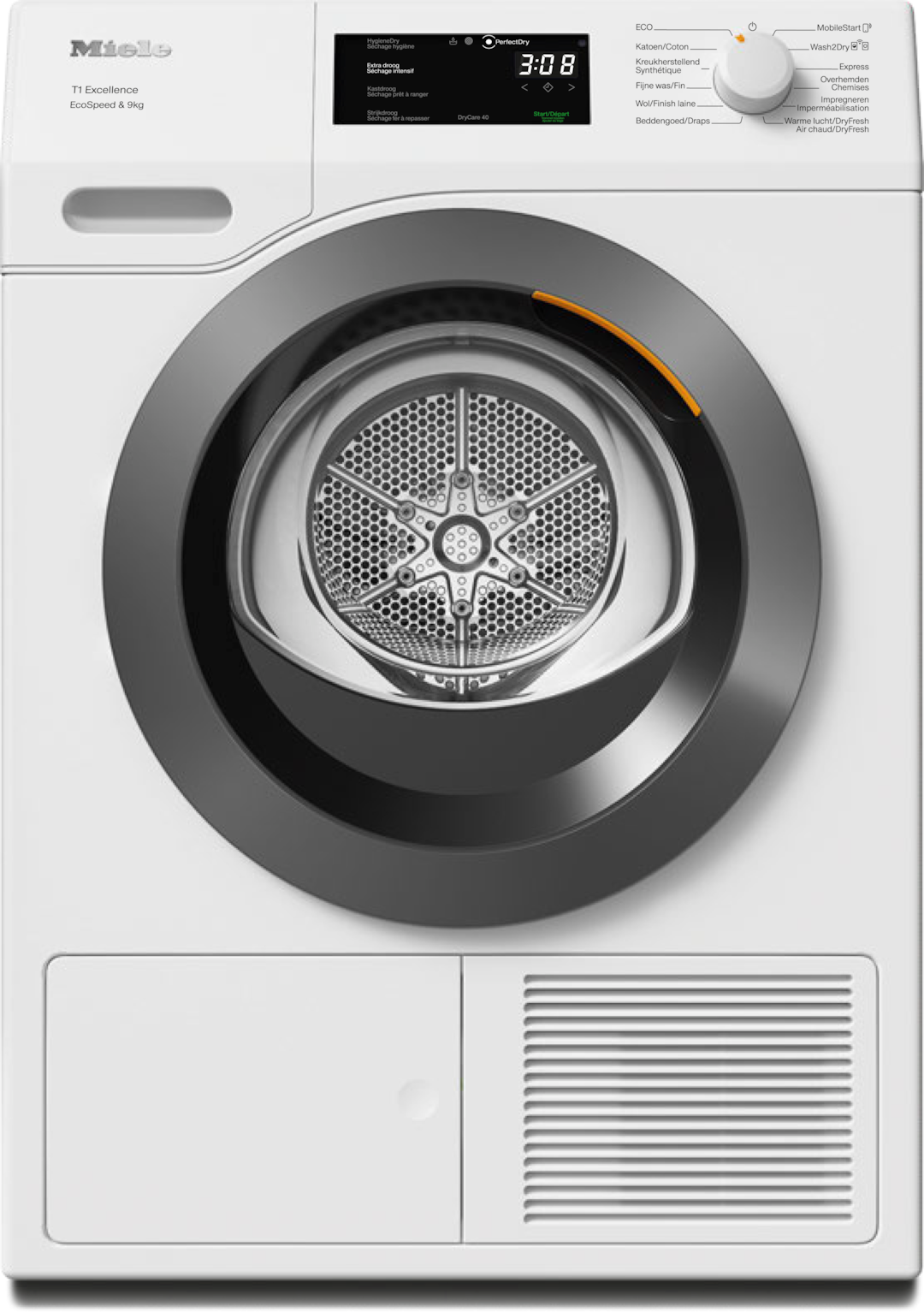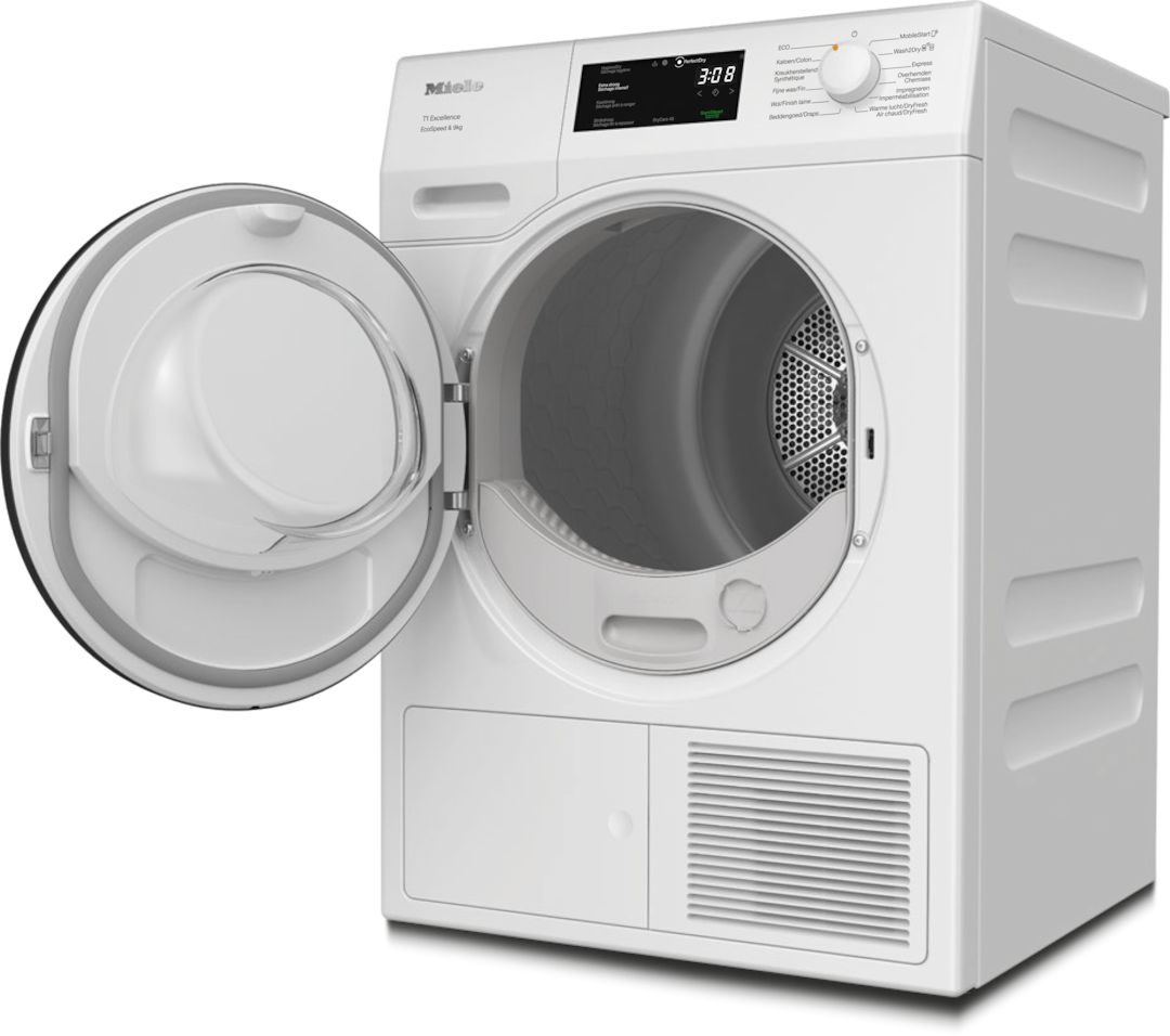 - 8.Gain de temps calculé par rapport aux sèche-linge Miele sans la fonction EcoSpeed avec la même charge et une efficacité énergétique similaire. Résultat testé avec le programme “Coton” à pleine charge.