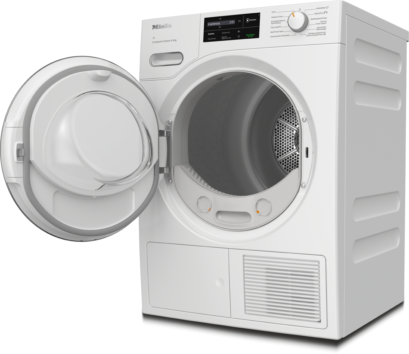 - 8.Tijdsbesparing berekend ten opzichte van Miele droogkasten zonder EcoSpeed, met dezelfde waslading en vergelijkbare energie-efficiëntie. Getest in het programma Katoen met volledige belading.