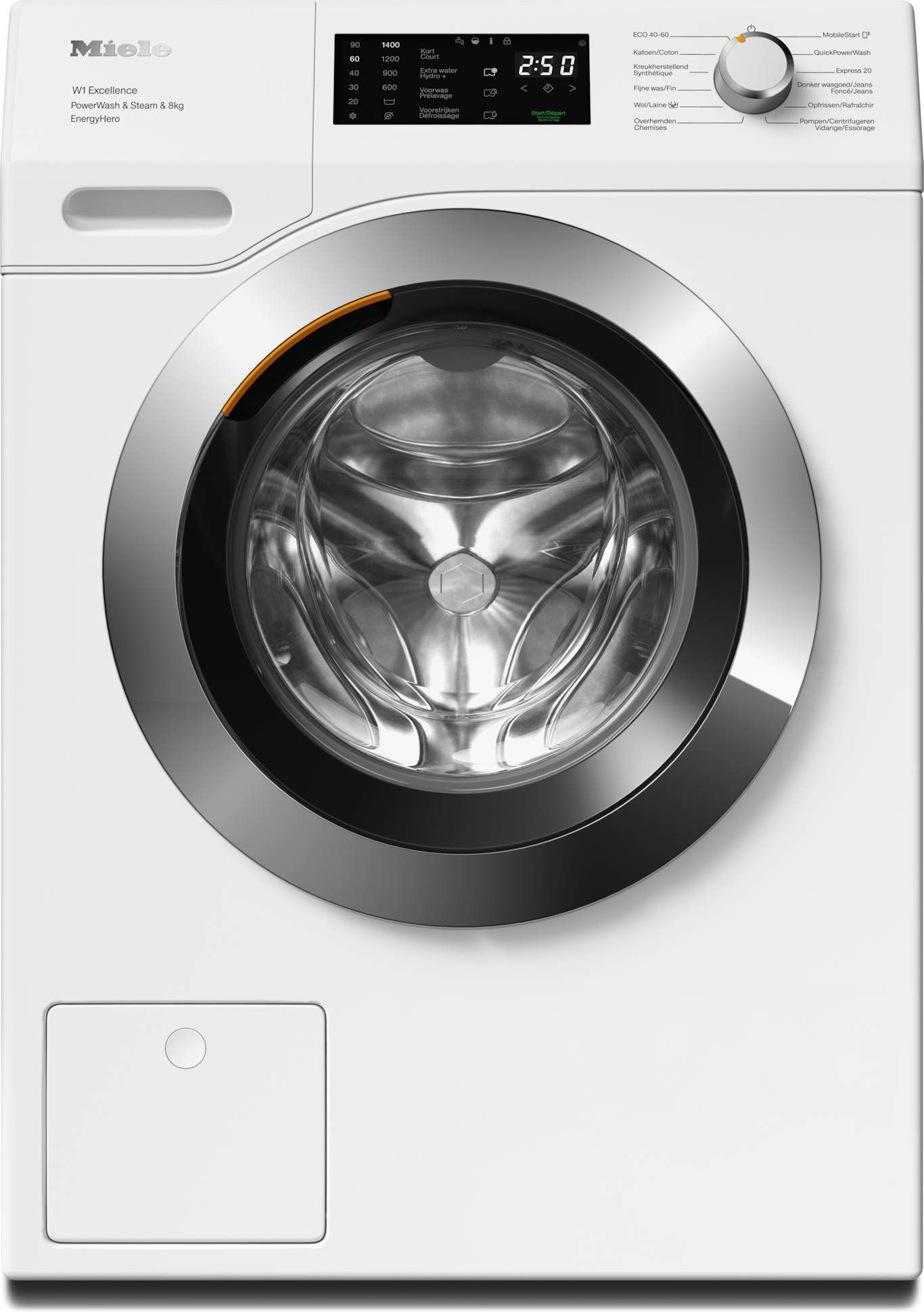 - 5.Tijdens de ontwikkelingsfase van de wasmachines uit de serie W1/W2 heeft Miele de modellen en belangrijkste componenten getest in 5000 wasbeurten (= 5 wasbeurten per week gedurende 50 weken per jaar) in verschillende programma's. Meer: miele.com/20years
