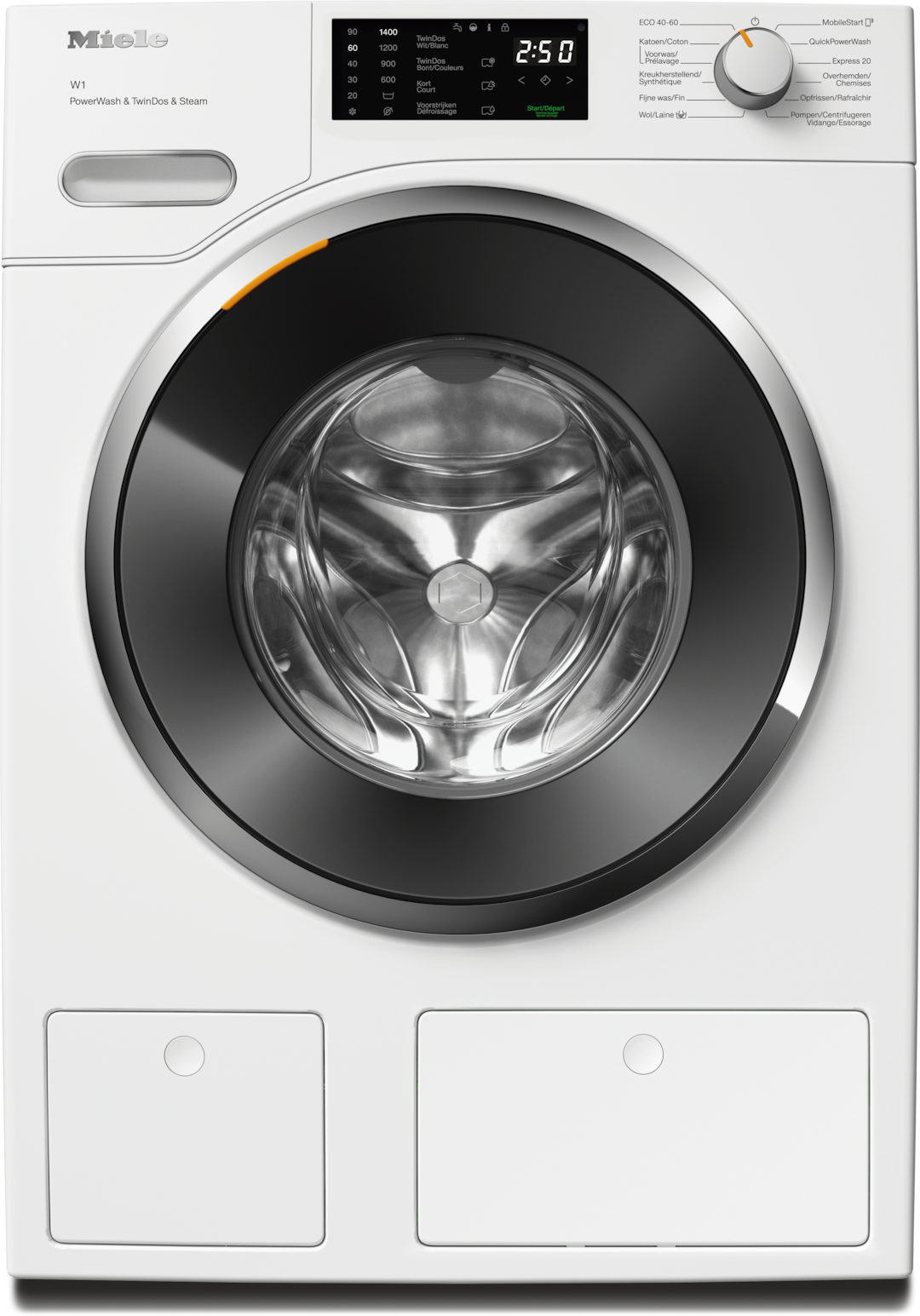 - 7.Tijdens de ontwikkelingsfase van de wasmachines uit de serie W1/W2 heeft Miele de modellen en belangrijkste componenten getest in 5000 wasbeurten (= 5 wasbeurten per week gedurende 50 weken per jaar) in verschillende programma's. Meer: miele.com/20years